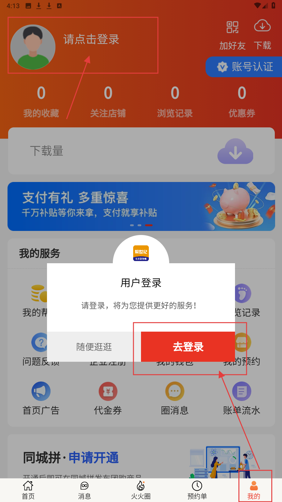 1、打开APP,进入【我的】页,点击【请点击登录】,在弹窗选【去登录】。