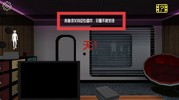 2、进入游戏场景,留意任务提示(如“我必须关闭这些窗帘,尽量不被发现”),按照提示完成任务,推动游戏进程。