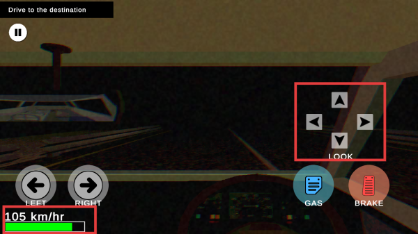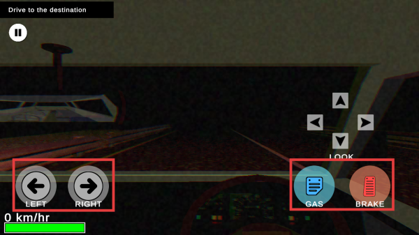 1、游戏开始,明确任务是“Drivetothedestination”。通过左下角的“LEFT”和“RIGHT”按钮控制转向,右下角的“GAS”和“BRAKE”按钮控制车速。