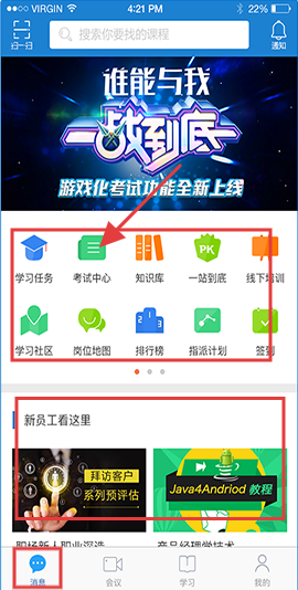 1、打开APP【消息】页,浏览功能(学习任务、考试中心等)、新员工课程(拜访客户、Java教程)。