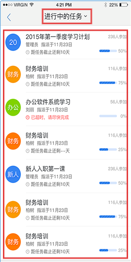 3、查看【进行中的任务】,跟踪学习计划(财务、办公、新员工培训等)进度,完成学习/考试任务。