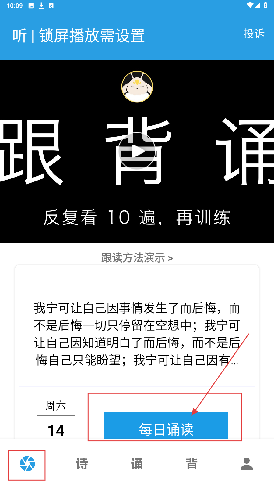 1、打开APP,在首页点【每日诵读】,进入诵读内容页。