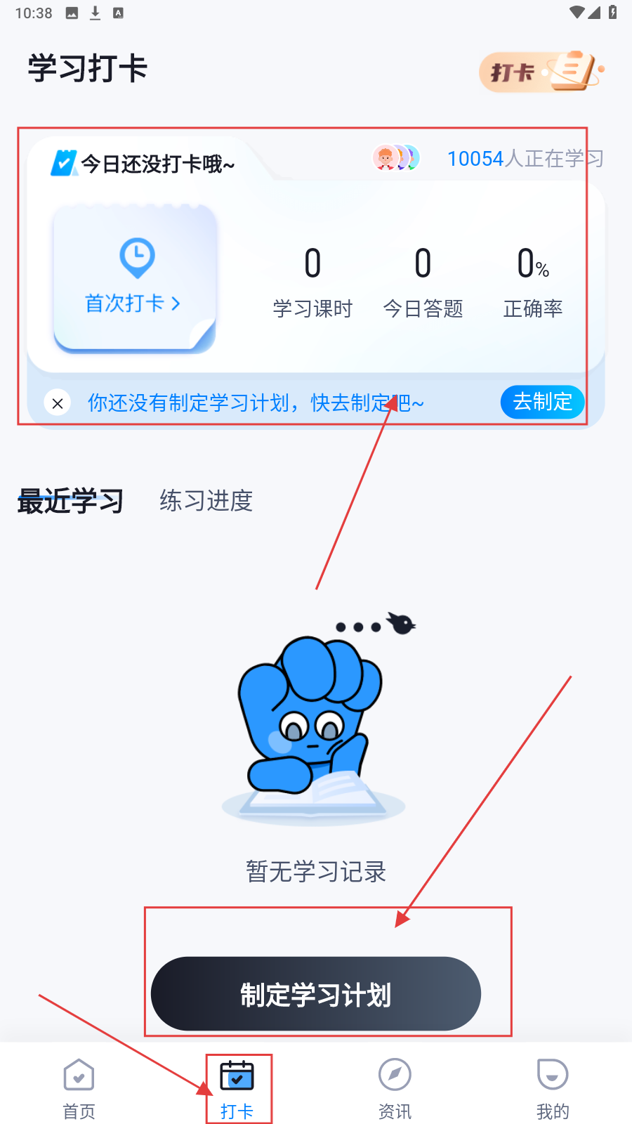 2、进入【打卡】页,点【制定学习计划】,设置学习目标,完成首次打卡。