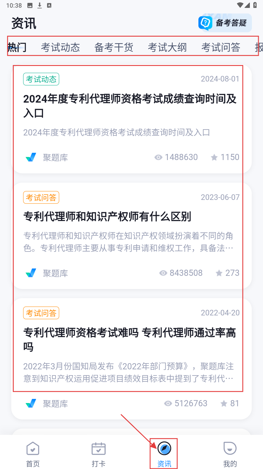 3、切换到【资讯】页,浏览考试动态(成绩查询)、备考干货、考试问答(专利代理师与知识产权师区别等),获取备考信息。