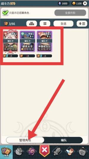 1、游戏前期,点击“管理角色”,查看已招募角色(如竹妖、破壳水矛、神兵枪兵队),了解其属性和特点,合理编队以应对不同战斗。