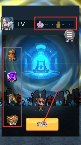 1、游戏初始界面,留意体力和金币数量,通过“背包”管理道具,“符文”提升角色能力,“扫荡”快速获取资源,“宝箱”开启奖励。