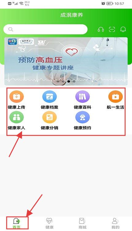 1、打开APP,在底部点【首页】,进入首页,可使用健康上传、档案等功能,看到预防高血压讲座。