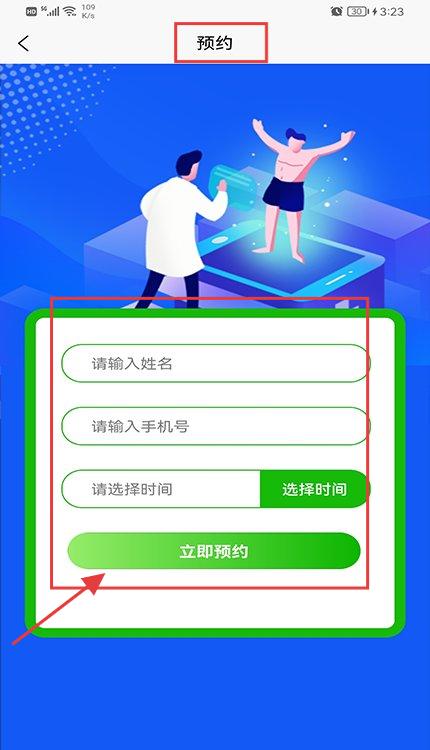 2、在首页点【健康预约】,进入预约页,填姓名、手机号、选时间,点【立即预约】完成预约。