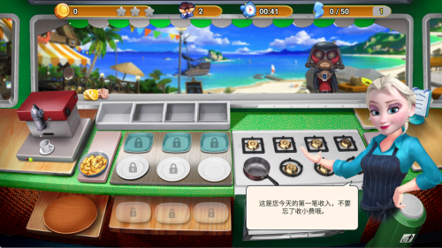 3、制作售卖美食:根据顾客订单,触屏操作完成美食制作,从备料到烹饪,把控每个环节,及时上菜获取收益。