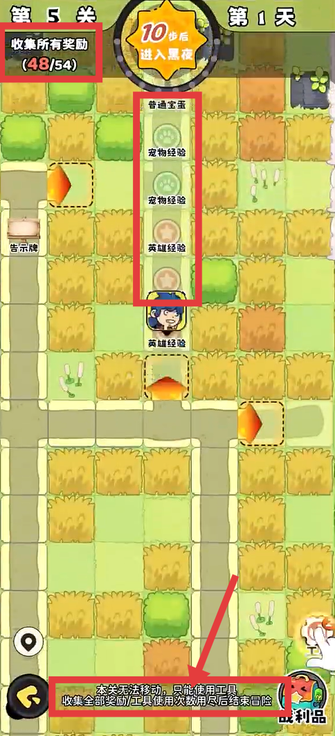 1、在关卡中,留意任务目标,如“收集所有奖励(48/54)”,通过使用工具(本关无法移动,只能用工具)获取“普通宝宝”等奖励。