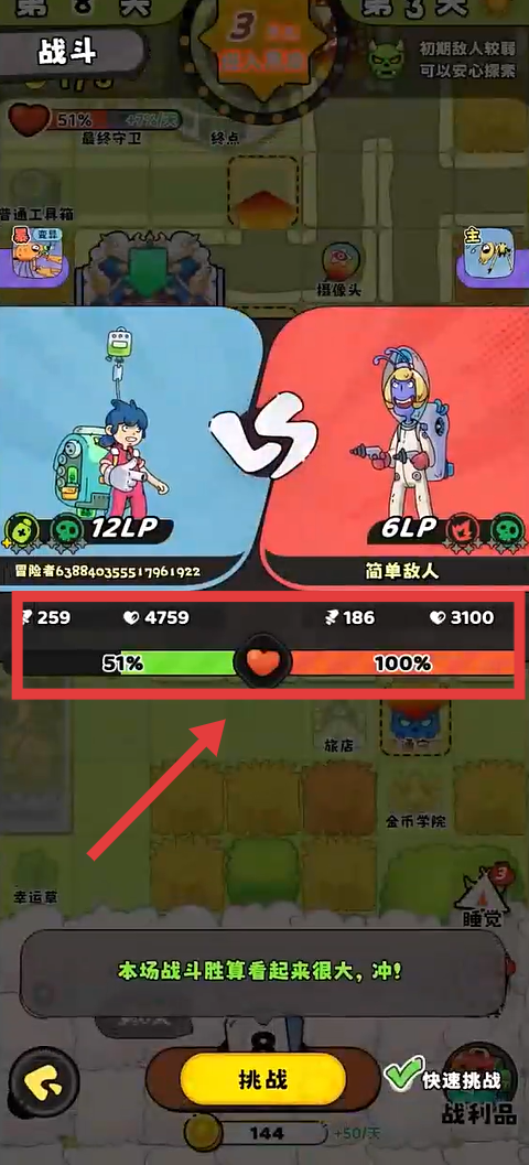 3、战斗时,查看双方属性,根据“本场战斗胜算看起来很大”等提示,点击“挑战”或“快速挑战”按钮,战胜敌人获取战利品,提升角色实力。