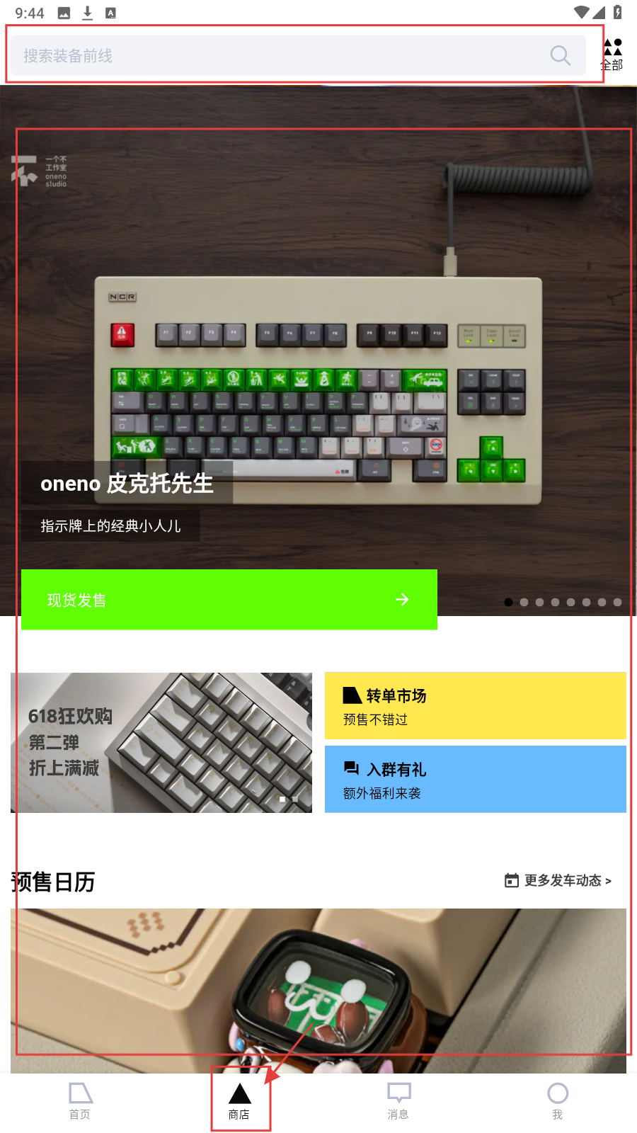 2、在【商店】页面,有“oneno皮克托先生”键盘等商品展示,还有618狂欢购、转单市场等活动入口,点击对应商品或活动入口查找参与。
