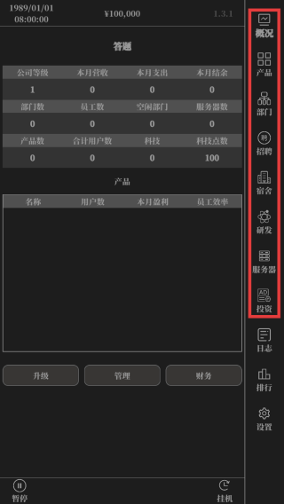 1、游戏开始,通过右侧菜单栏“概况”查看公司初始状态,了解资金(¥100,000)、公司等级、营收支出等信息,为后续决策提供基础。