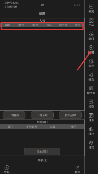 2、进入“招聘”界面,关注人员的“潜力”“能力”“抗压”等属性,挑选合适人才,利用“一键录取”等功能扩充员工队伍。