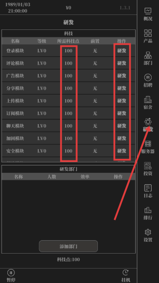 3、在“研发”界面,依据现有科技点数,选择“登录模块”等科技项目进行研发,投入资源提升公司科技水平,为产品开发和业务拓展提供支持。