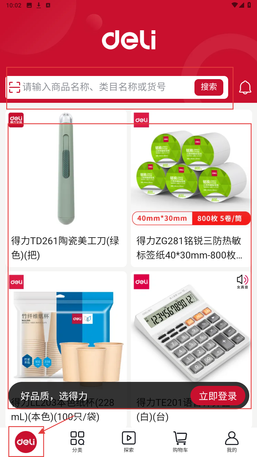 1、打开APP,在底部导航点【首页】,进入首页内容页,页面显示得力TD261陶瓷美工刀等商品,还有搜索栏,点击对应商品使用。