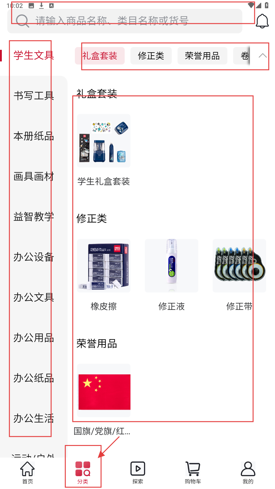 2、在【分类】页面,有学生文具、书写工具等分类,选择【学生文具】后点击【礼盒套装】等子分类,查找对应商品。