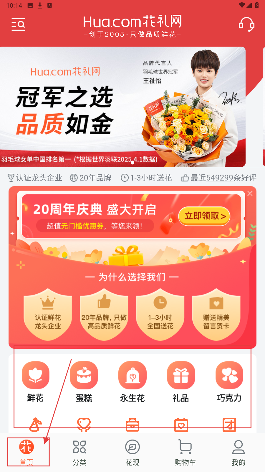 1、打开APP,在底部导航点击【首页】,进入首页内容页,页面显示20周年庆典活动及鲜花、蛋糕等功能入口,点击对应功能使用。