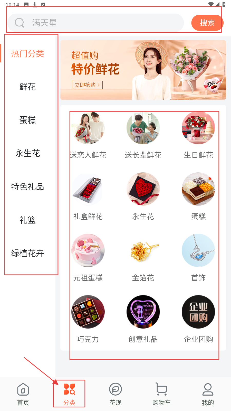 2、在【分类】页面,有热门分类(鲜花、蛋糕等),点击对应分类(如鲜花)及子分类(送恋人鲜花等)查找商品。