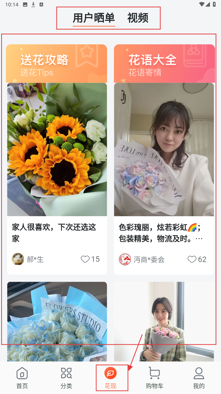 3、切换到【花现】页面,显示用户晒单、送花攻略、花语大全等内容,点击对应攻略/晒单可查看详情、参与互动。