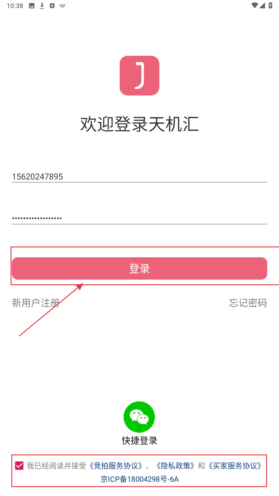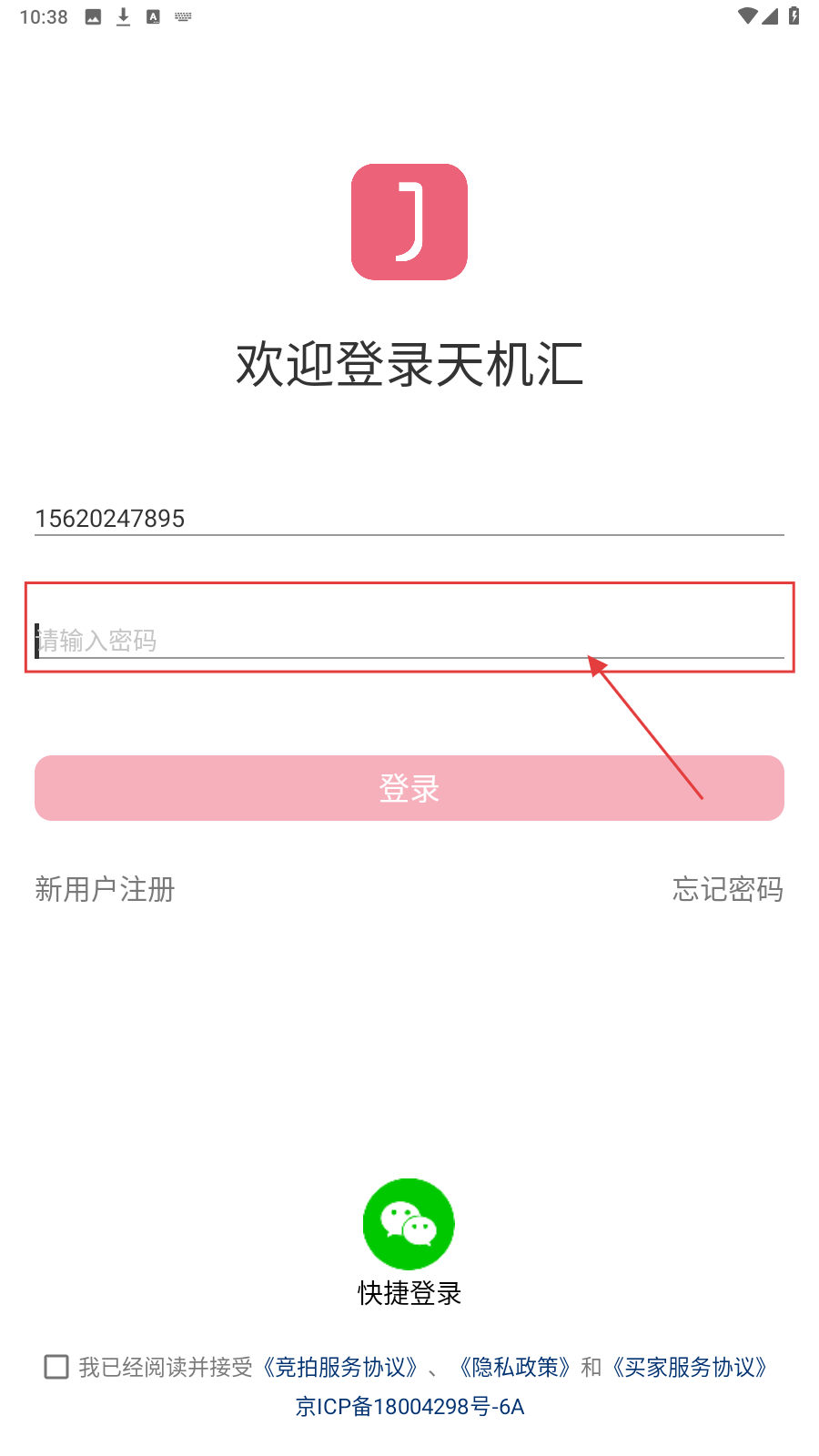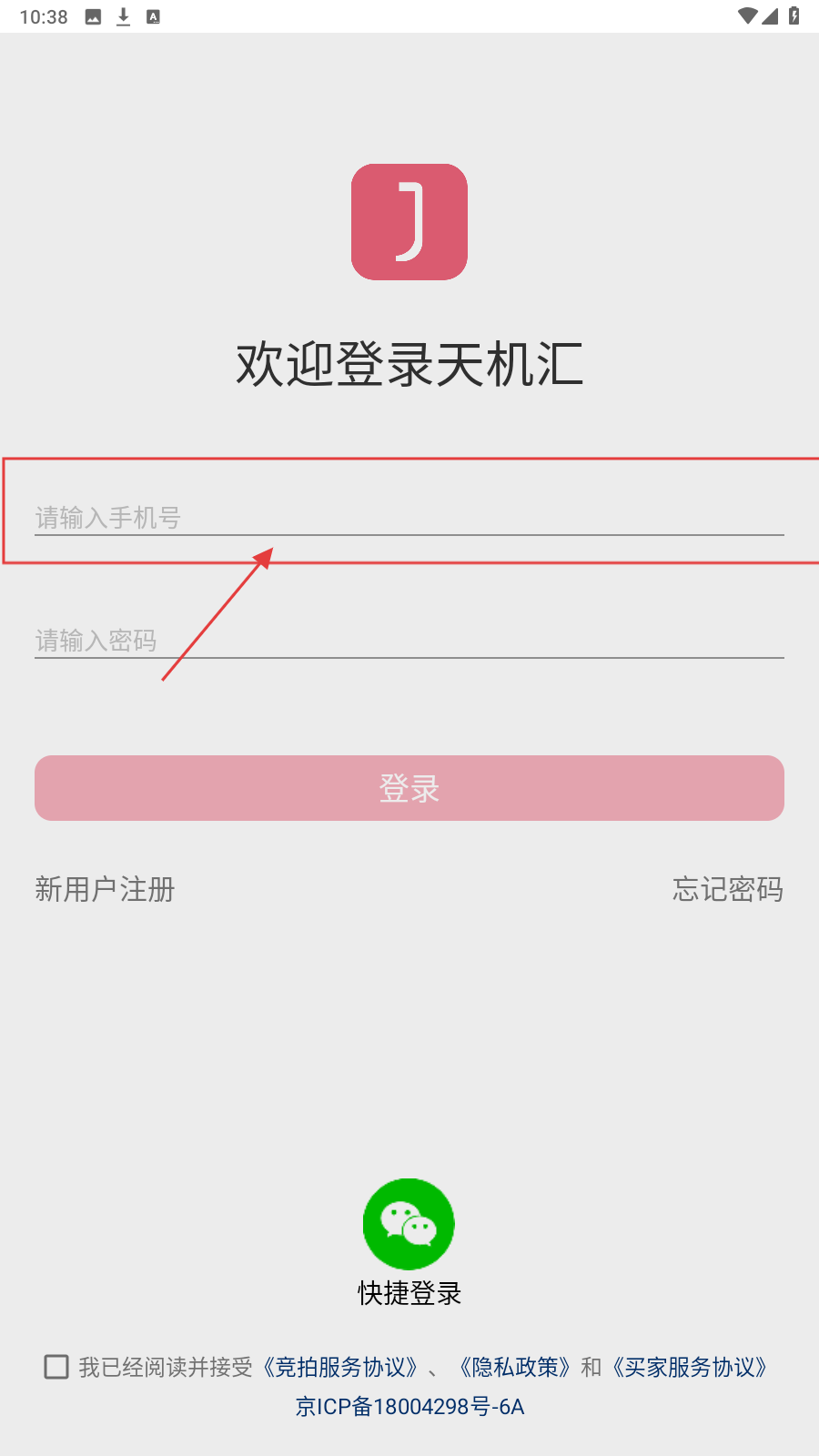 1、打开应用,进入登录页面,显示“欢迎登录天机汇”标题,有手机号、密码输入框,点击输入框准备填写信息。