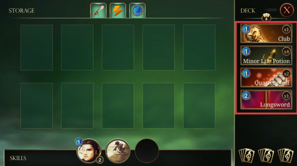 2、进入卡牌管理界面(如“DECK”),查看拥有的卡牌,了解其消耗点数和效果。合理安排卡牌在“STORAGE”栏位,构建高效卡组。