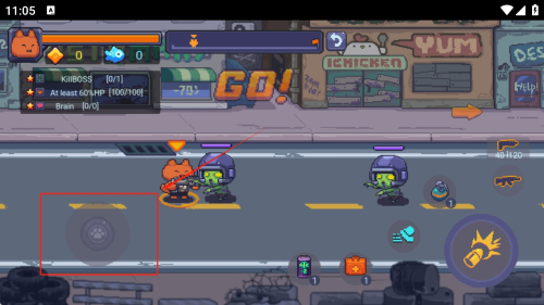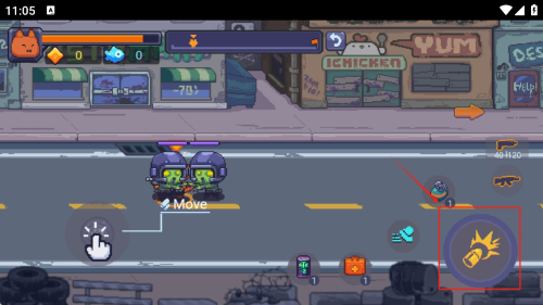 2、如何控制角色:使用虚拟摇杆控制角色移动,点击攻击按钮进行射击。