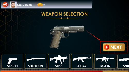 2、如何选择合适的武器:在“WEAPON SELECTION”界面选择并点击“NEXT”按钮。