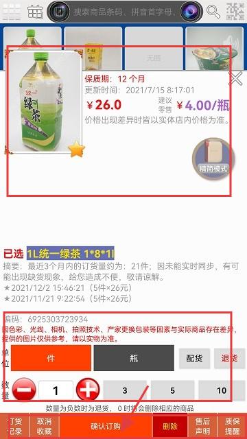 3、选中商品,进入商品详情页,显示保质期、价格等信息,可选择订货单位(件/瓶)、数量,点击【确认订购】完成采购操作。