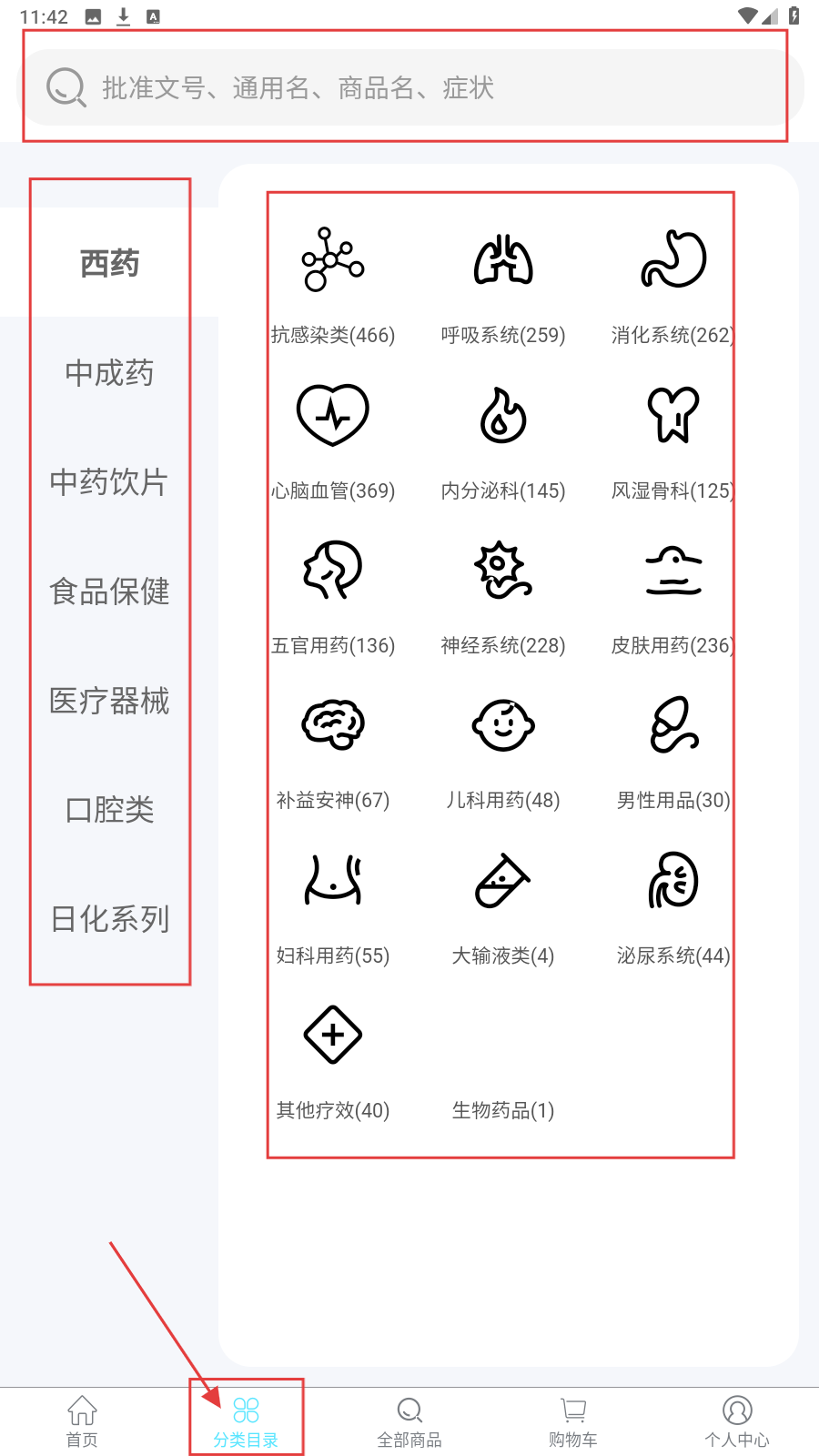 2、切换到【分类目录】页面,左侧选分类(如西药),右侧查看子类(抗感染类、呼吸系统等),点击子类查找对应药品。