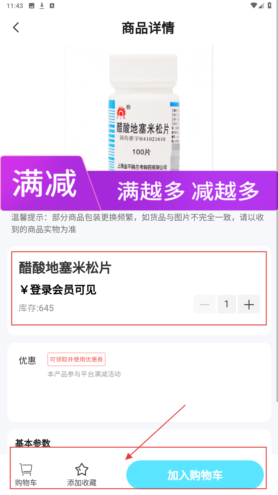 3、进入商品详情页,显示商品图、价格、库存等,点击【加入购物车】,完成商品选购流程。
