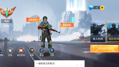 1、如何进入游戏:点击“快速开始”进入游戏模式选择。