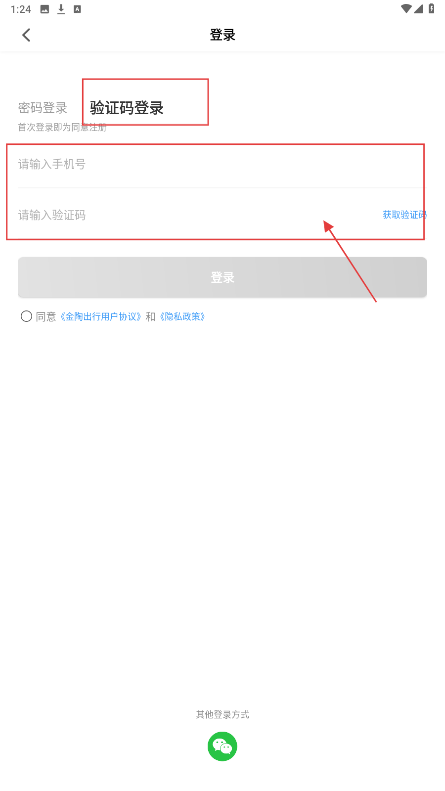 2、选“验证码登录”,填手机号,点“获取验证码”,收到后填验证码框。