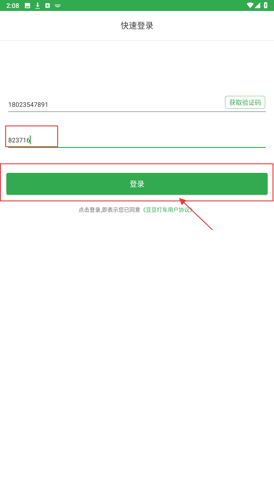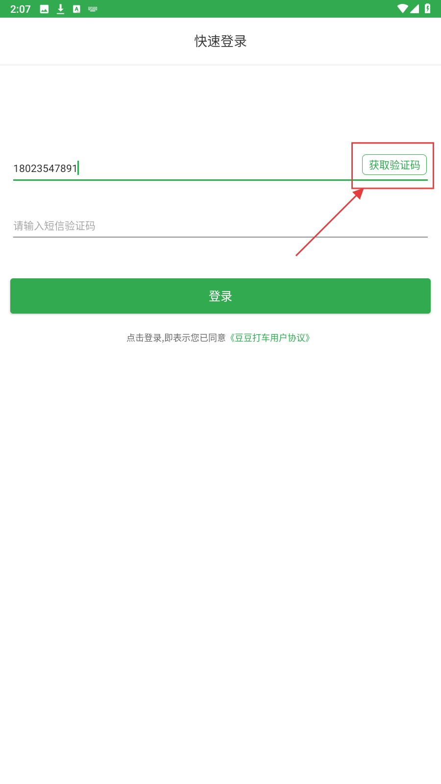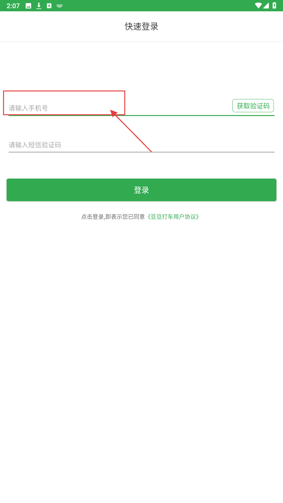 1、打开“豆豆打车”应用快速登录页,在手机号框填号码。