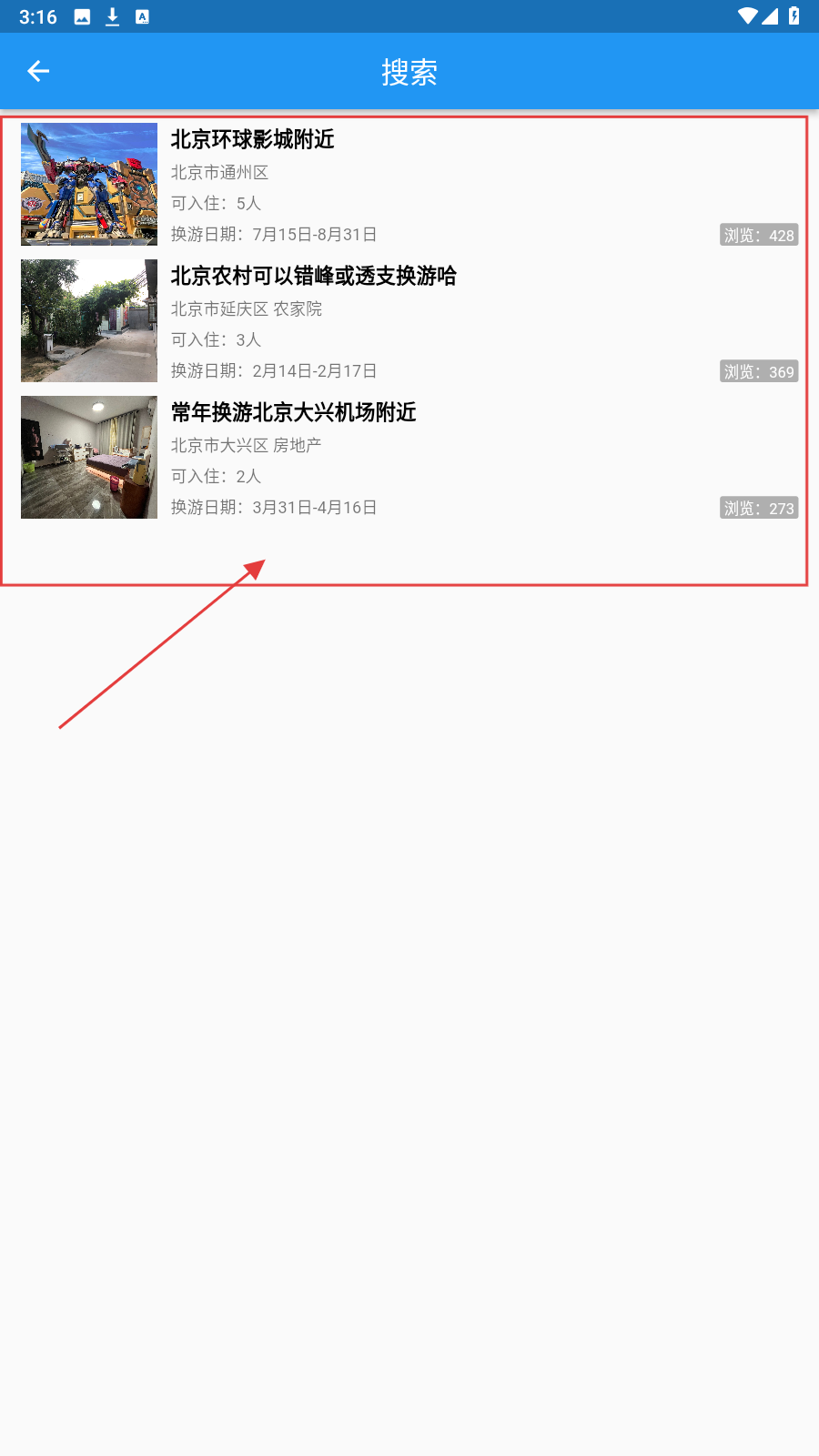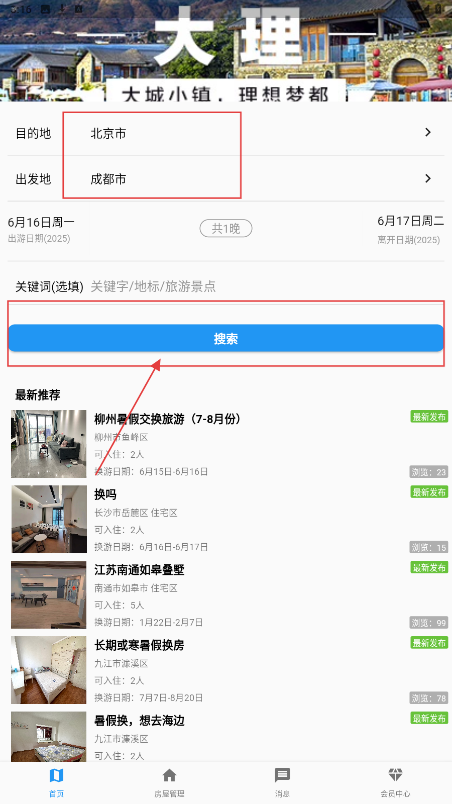 2、点击【搜索】,查找符合条件的换房/旅游推荐(如北京环球影城附近等房源)。