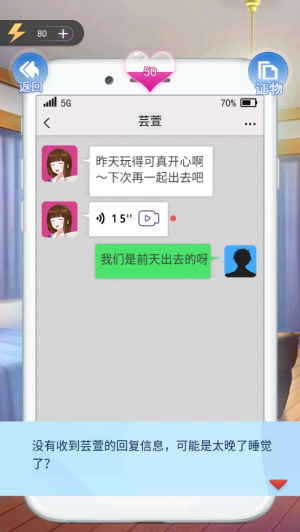2、完成互动任务:与女友进行聊天、约会等交互,根据任务提示完成活动,推进剧情发展。