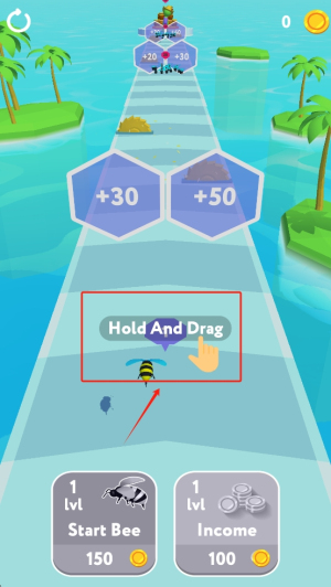 1、开始游戏:拖动屏幕上的蜜蜂到路径上,合并相同等级的蜜蜂以升级。