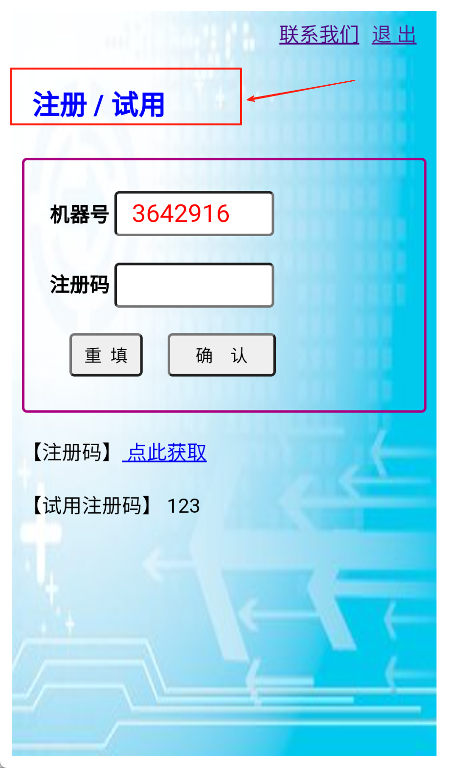 2、试用的话就进注册页哟,系统会自动显示机器号3642916那个数字,在注册框里填试用码123体验基础功能吧。