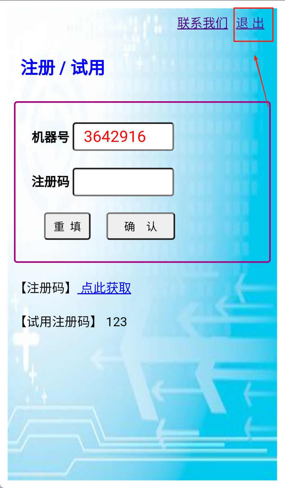 3、填完注册码记得按确认键哟,输错了点重填重新来,需要帮助戳顶部联系我们,用好了点退出键就能回到主界面啦。