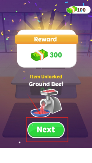 3、领取奖励:完成切割后,点击“Next”按钮领取奖励并继续游戏。
