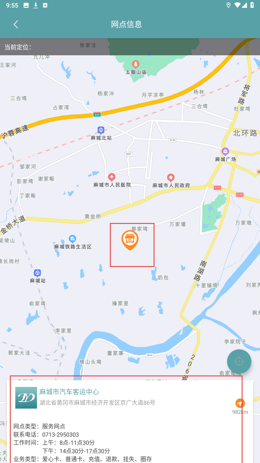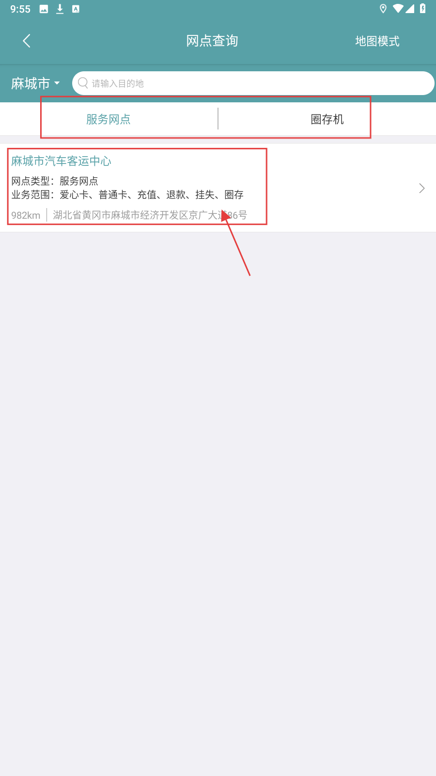 2、选“服务网点”或“圈存机”,查看网点列表(如麻城市汽车客运中心)。