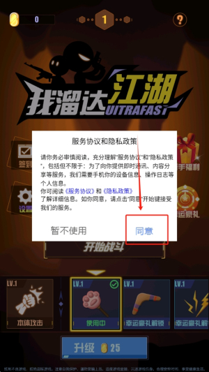 1、接受服务协议:打开游戏后,阅读并同意服务协议和隐私政策,点击“同意”按钮以继续。