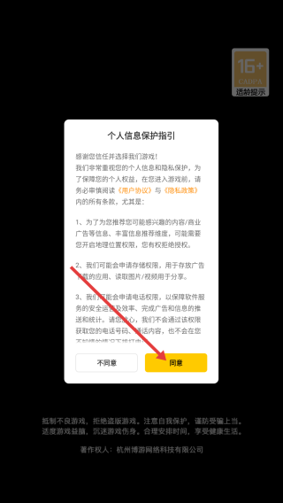 1、进入游戏,点击【同意】。