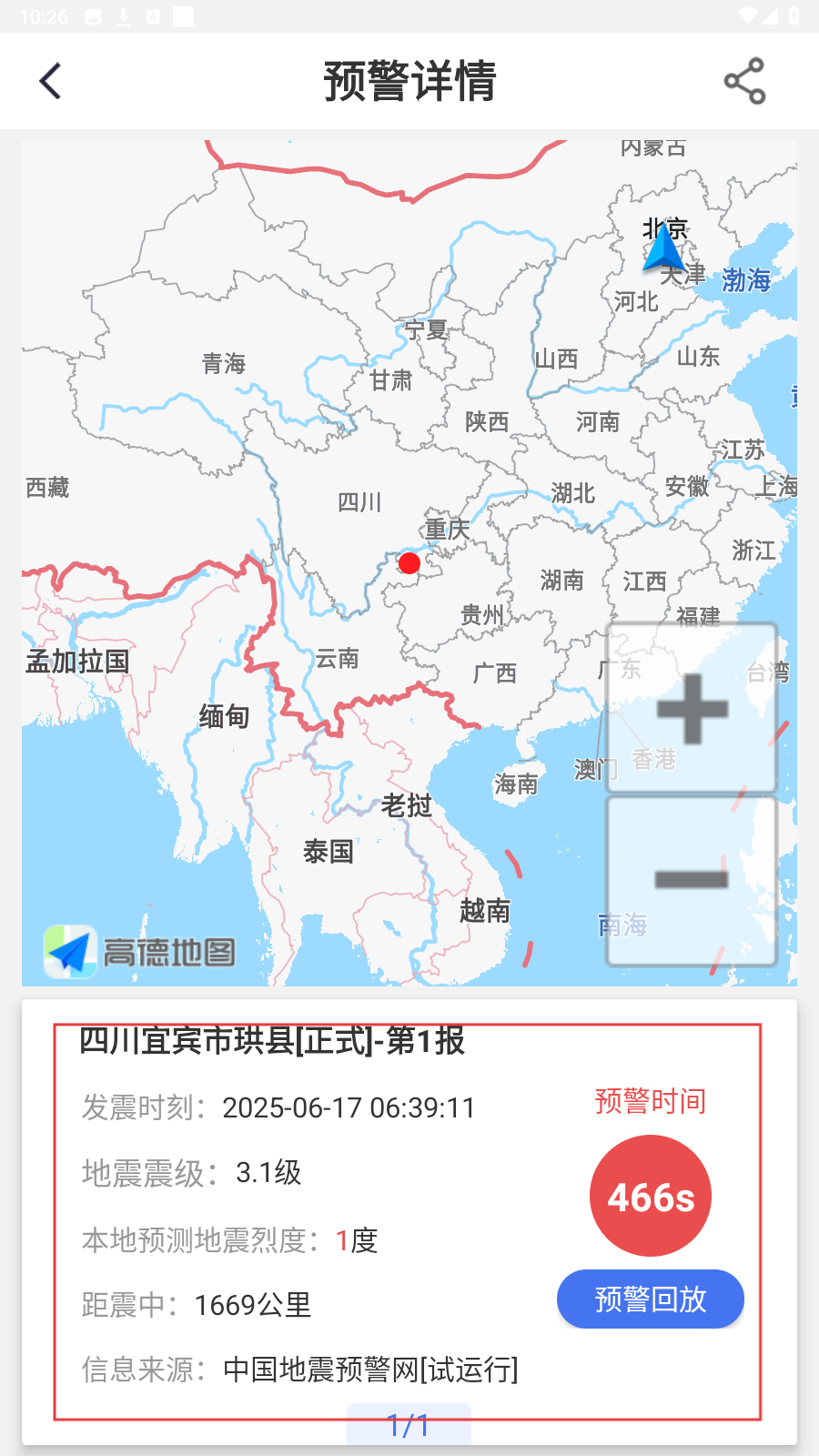 2、软件【预警详情】,展示四川宜宾市珙县地震记录,点击对应地震条目可查看预警详情。