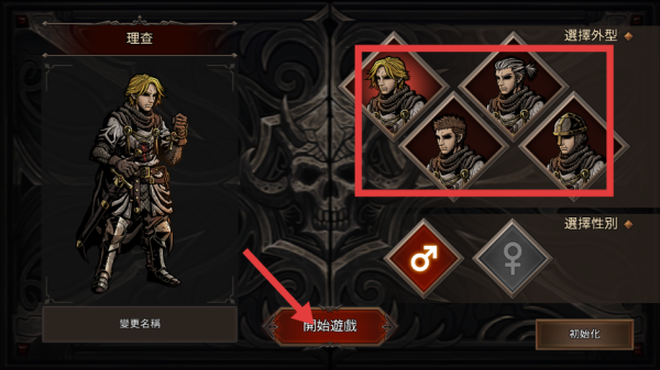 1、在角色创建界面,选择喜欢的角色外型和性别,设定好角色名称后(可通过“變更名稱”修改),点击“開始遊戲”进入游戏。