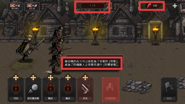 3、按照提示操作,按住下方的兵种卡片召唤步兵,最多可召唤3名。还可利用其他兵种和技能,合理安排兵力和策略,完成关卡任务。
