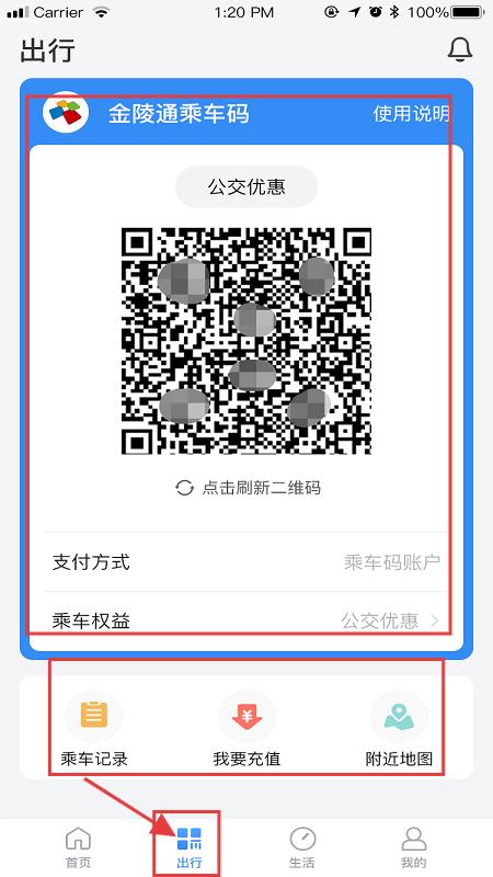 1、打开应用,在【出行】页,展示“金陵通乘车码”、支付方式、乘车权益,点击【乘车记录】【我要充值】【附近地图】可使用对应功能。