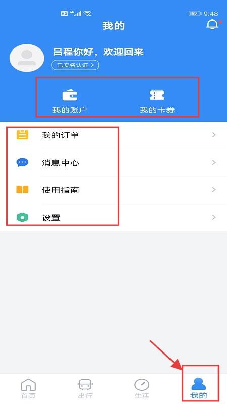 3、进入【我的】页,有【我的账户】【我的卡券】管理入口,及【我的订单】【消息中心】等功能,点击可操作个人服务。