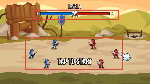 1、游戏初始界面,看到红蓝两方火柴人对峙,上方显示双方兵力(均为3)。点击“TAPTOSTART”开始游戏,进入战斗环节。