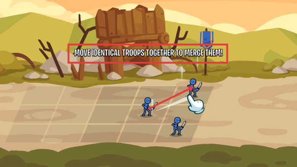 2、战斗中,根据提示“MOVEIDENTICALTROOPSTOGETHERTOMERGETHEM!”,将相同颜色的部队移动到一起进行合并,提升部队实力。